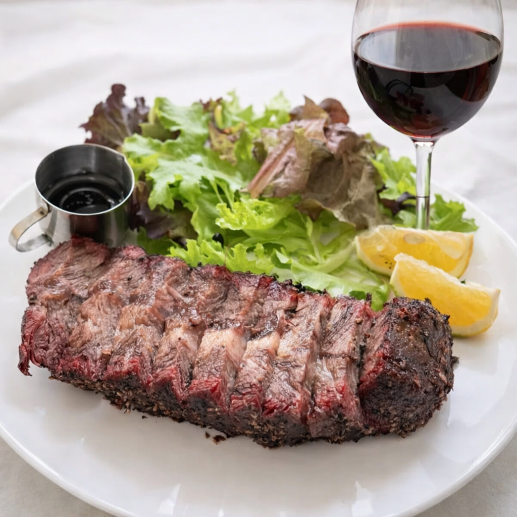Merlot 以柔順單寧與成熟果香為特色,搭配煙燻板腱牛肉的肉質與燻香,能讓單寧更加圓潤,提升整體風味的深度與結構感,呈現經典紅酒與肉類的平衡搭配。