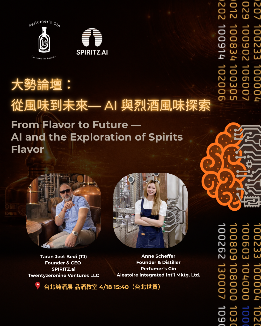 本次論壇將邀請 Spiritz.AI 創辦人 Taran Jeet Bedi (TJ) 與 Perfumer’s Gin (香水師琴酒) 共同交流,聚焦人工智慧與烈酒創新的結合。Spiritz.AI 是一個 AI 驅動的全球酒類探索平台,透過酒瓶掃描、AI 侍酒師與全球酒類資料庫,協助使用者解析風味、產地與製程,並提供個人化推薦與市場洞察,致力於建立全球酒類文化的智慧系統。Perfumer’s Gin 則以「香水調香邏輯」設計琴酒風味,結合香氣結構、植物原料與蒸餾工藝,打造具有香氣層次與文化敘事的精品琴酒,並曾榮獲 World Gin Awards 世界琴酒大賽獎項。此次交流論壇將透過 AI 技術與蒸餾藝術的跨界對話,探討未來酒類產業在數據、風味設計與全球市場上的創新可能。