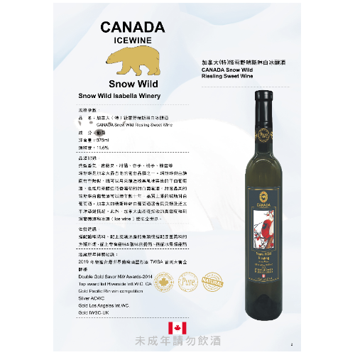 CANADA Snow Wild Riesling Sweet Wine Typical aroma: green apple, citrus, apricot, peach, honey, etc. Riesling is one of the oldest grape varieties in Canada. Riesling is somewhat similar to Chenin Blanc, and can be used to make dry white wines with outstanding stone fruit flavors and sweet white wines with strong floral aromas. The sweetest white wines from Rislin can be aged for decades. A high-quality white wine from Rislin. Canadian Risling dry white wine is suitable for pairing with shellfish and Pan Pacific dishes. In addition, Canada’s late-harvested high-sweet Swissline wine and Ice wine are famous all over the world. Warning: No drinking and driving 、 Drinking alcohol under the age of 18 is prohibited